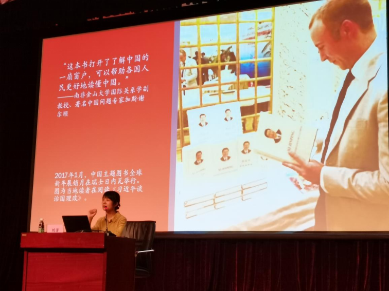 并将《习近平谈治国理政》的英文译本与百度翻译的译文进行对比,从专业用词、主语一致性、直译与意译的比较等角度,带领听众感受《习近平谈治国理政》英文译本里用词遣句的精妙之处。在场听众积极与刘芳进行互动交流,现场气氛热烈融洽。