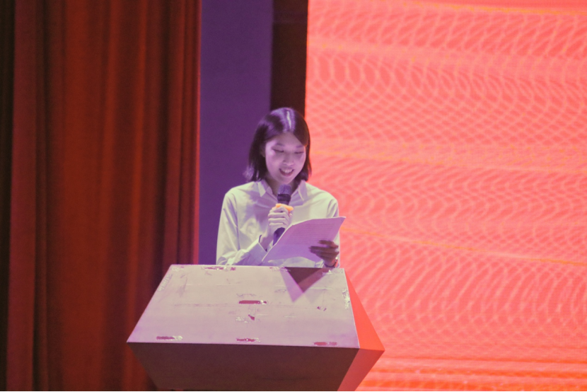 本科老生代表苏晓楠对新生加入英教大家庭表示热烈的欢迎和祝贺。她向新生展示英教给予大家的发展平台——浓厚的的学习氛围,互帮互助的同学,循循善诱的老师。她希望同学们养成诚信、卓越、包容的学习观,自律自强,秉持包容谦卑且自信的态度,以卓越为目标,积极迎接大学生活,领悟教育的魅力和真谛。