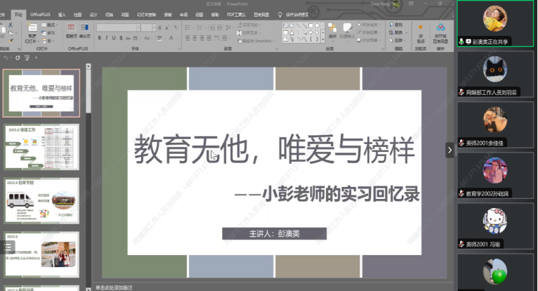 2023年9月7日晚8点,伟德国际194619级优秀毕业生彭澳美为20级全体实习生就实习经历做了线上分享,介绍实习流程、心路历程以及如何最大化利用实习。师姐以福禄贝尔的名句:“教育无他,唯爱与榜样而已”为主题分享她的实习回忆录。