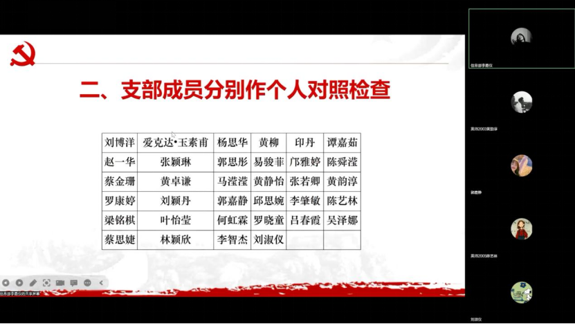 随后,党支部成员分别从理论学习、政治素养、工作作风、能力本领、担当作为等方面查找问题和不足。每个党员认真根据实际情况,实事求是地展开批评与自我评判,通过对照检查,在思想上有所触动,行动上有所改进,学习上有所提高,作风上有所转变,纪律上有所增强。