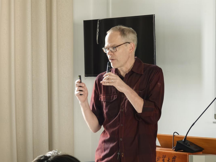 首先,Dr.Sanford向在座学生及教师简单介绍了Communicative Language Teaching(CLT)这一教学方法以及此次讲座的六个核心内容。在讲授过程中,Dr.Sanford不仅强调了有关交际语言教学法的几个关键原则,同时结合自己的实际教学经验,向大家讲述了教师在实施交际语言教学法时面临的几个挑战