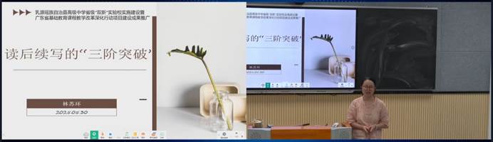 林苏环老师做最后的主题分享。她对学生读后续写能力不足进行了学情分析后,总结了读后续写的“三阶突破”方式——高一基础构建,高二专项技能突破,高三综合提升+应试训练。通过系统训练,帮助学生切实提升续写能力和分数。