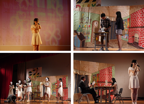 1202班《Who Murders My Love》通过两段故事,展现爱情死亡的宿命,究竟是什么谋杀了爱情?剧中穿插意识流的元素,一群戴着白色面具的白衣女子,手持一支白花,向两位主角投去,以祭奠被谋杀的爱情。这是大一学生纯原创作品,尽管在舞台布置上较为朴素,但创新的剧情和手法都值得肯定和继续发扬,最终荣获三等奖。