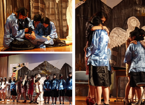 1101班上演的《金陵四钗》赢得了全场最热烈的掌声。1937年南京沦陷,教会学校女学生、秦淮河畔风尘女子,还有一个美国人约翰,共同面对一场生死浩劫,产生了各种各样奇妙的感情。然而,女学生被日军强征去庆功会,谁都知道,这将是一条凶多吉少的不归路。女学生们不甘被日军凌辱,准备集体跳楼自杀,却被妓女们救下。金陵四钗在侵略面前,彰显了舍身救人的真善美,完美演绎了爱的回归历程。