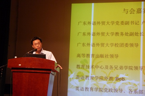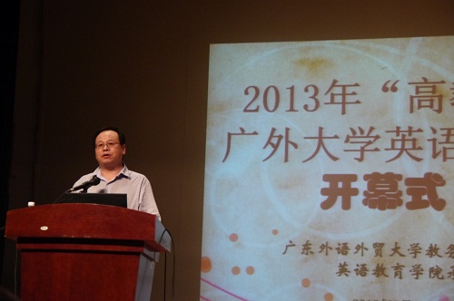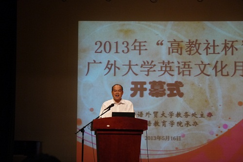 随后,教务处副处长尚敏锐讲话,他认为大学英语文化月活动原本是一个会湮灭在众多活动中的活动,但通过广大同仁的努力发展了起来并生生不息。英语文化月活动具有高参与度和高影响力,既能丰富课外活动,营造学习浓厚的英语气氛,强化学子的英语应用能力,丰富第二课堂活动,又能满足学生个性化发展要求,实现学生素质的国际化。尚教授谦虚地引用了何德生老师的话:教师肩负着传道授业的指责,但更肩负着培养学生人格、影响人的思想品德的重任进入课堂。这不禁让广外学子联想到广外大的校训“明德尚行,学贯中西”。