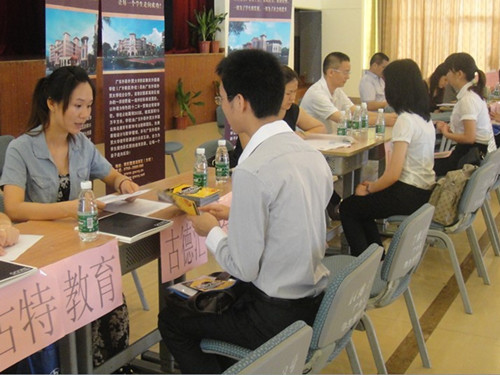 招聘会于上午10点正式开始。有一些同学早早就在会场中的休息区等候着,他们身着正装,翻看着简历,默默地为接下来的面试提前做着准备。在南海实验中学的摊位前,来自081班的贝锦鹏正在接受面试。自我介绍、回答问题、情景处理,贝锦鹏一路从容应对,沉着冷静,其全程流畅的英文回答得到了面试官的肯定。在之后的采访中,小贝也显得十分自信,并提到自己流利的口语主要得益于先前在广外外校的实习经历;谈到自己将来的职业发展方向,小贝说还是会选择当老师,这是在之前的三下乡活动中就已经做好的抉择。随后,伟德国际1946085班的刘芬英也接受了采访。小刘在采访前已经面试了一所学校和一家杂志社,她告诉记者,学校方面希望能招聘到教学好、基础扎实的人才,而企业则偏向于综合能力好、能够吃苦耐劳的人才。