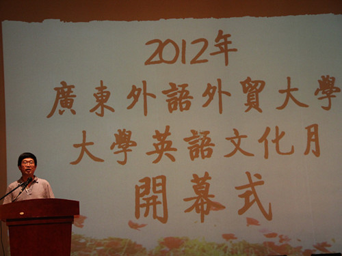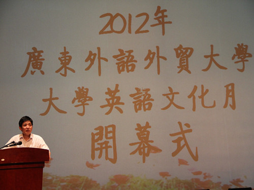 在开幕式上,教务处处长詹文都做了讲话,他强调了广外大英语文化月系列活动在凸显我校大学英语教学特色方面的重要性。詹处长提到,去年以来,我校获得一系列荣誉,如我校被评为“教育部第三批大学英语教学改革示范点”单位,我校的“大学英语系列课程”被评为广东省精品课程,曾丹等十多位教师在全国各级各类教学比赛中获得优异成绩,以及曾丹丹、张瑶等一批学生在全国各种英语教学和演讲比赛中获得一等奖等殊荣。詹处长对伟德国际1946的教学改革成效和教师、教学水平的不断提高给予了充分的肯定,并希望伟德国际1946努力把大学英语文化月系列活动办出特色、办出水平,也表示学校会对大学英语教学给予一如既往的支持。