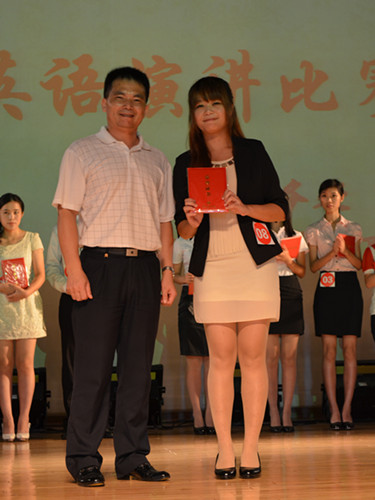 同样来自管理学院的8号选手兰紫君,则采用一则幽默的笑话引入她的主题:假设22岁的比尔盖茨到中国求职,问他能否求职成功。答曰:不能。因为他既没有本科学历,也不是党员。由此引出她的主题:面对挑战与机遇,内心的强大是非常重要的(We are young, we are equal, we are more competitive)。她的结尾铿锵有力:Welcome Mr. Opportunity; welcome Mr. Challenge; welcome Mr. Future。她的精彩表现获得全场的一片喝彩声。