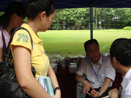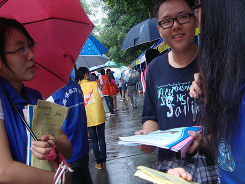 早上7时,辅导员迟殿凤老师与七名志愿者带上资料赶往北校。雨下得很大,老师和志愿者们冒着雨把一袋一袋的资料搬往咨询摊位,咨询摊位布置好。尽管很累,但是自愿者们坚持站在雨中派发宣传小册,耐心地回答家长的问题,那雨中的微笑是如此的美丽,让人难忘与感动。