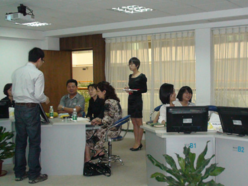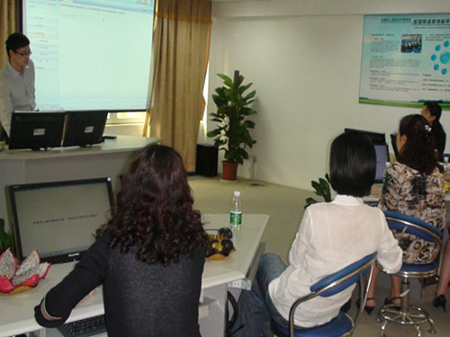 蓝鸽公司应用研究所推广中心主任李征华热情地接待了调研组的老师。李主任带领着应用研究所的成员,详细地介绍了蓝鸽语言实验室教学系统的新功能以及蓝鸽外语学习平台的具体模块和功能。他首先介绍了蓝鸽语言实验室的最新研发的成果——听写教学模块和口语训练模块,然后,他以教师的身份和学生的身份,介绍了蓝鸽开发的外语学习平台的各个模块和功能,尤其是如何利用该平台进行视听说试题的编制、作业发布,以及如何进行写作教学的应用。随后,双方就如何应用外语学习平台开展视听说课程教学和专业英语的教学进行了交流。