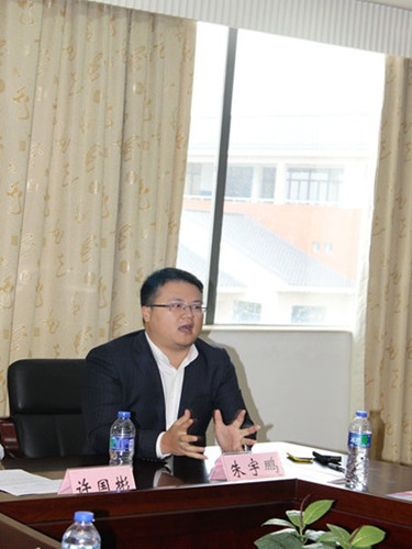 朱宇鹏在讲话中首先代表合生珠江教育发展基金的相关领导对大家致以诚挚地问候。他指出,此次项目来源于合生创展集团董事局朱孟依先生对山区小孩享受相对公平教育机会、提升山区教育水平的关心并感谢孟依先生对此作出的努力和支持。随后,他就如何整合和利用优质教育资源为山区教育服务以及基金会对此项目的作出的准备做了详细介绍。他表示,山区教育工作者坚守于山区教育,致力于山区教育事业发展的的精神是基金会努力给他们提供机会的原动力所在。他对在场的丰顺县教师说:“因为你们的努力,因为你们的全心全意,因为你们坚定不渝地推动山区教育事业的发展感动了我们,让我们也愿意去做这件事。”最后他介绍了项目的发展方向和计划并希望与广外和丰顺县教育局继续保持良好的合作关系。