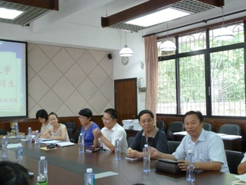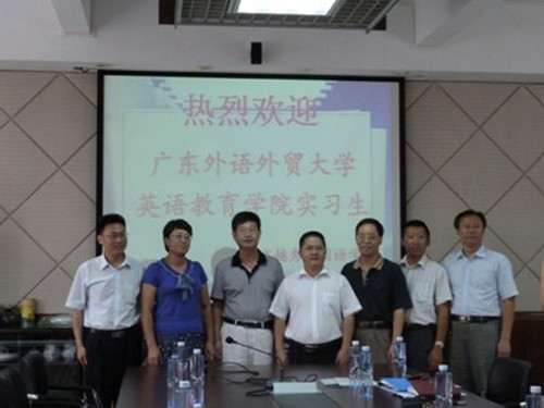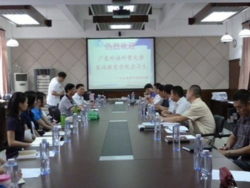 越秀外校的石远习校长、党总支书记杨建伟、副校长李洪奇、陈晓莲、严永铭以及教导处主任李志飞和英语科组长杨师民等10多位领导、老师在会议室接待了伟德国际1946实习队伍,李洪奇副校长主持见面会。