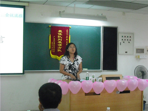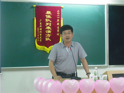 在同学们热烈的掌声中,院长霍海洪向2011级新生发表致辞。霍院长首先向上午刚结束军训生活的同学们表示衷心的祝贺和亲切的问候,并感谢全体同学献给学院的第一份礼物——获得最佳队列表演方块奖。接着,霍院长简单介绍了学院的基本情况,学院具有成立时间短但发展快的特点,特别是在教育改革方面,英教学院一直走在前列,积极探索大学英语教育改革,实现英语与教育的有机结合,并积极与港澳、新加坡等地高校交流。除此之外,学院的师资力量也非常雄厚,教师、学生的获奖情况很可观,包括国家级、省级、市级等各项大奖;学生就业率高达98%,就业前景一片大好。同时,在大学学习方面,院长也向学生提出了诚恳的建议:学会自主学习,利用好书本和实践这两个课堂,多元化学习。最后,霍院长提出了建设幸福学院的期愿,希望学生能感受到精神层面的幸福,茁壮成长,也动员每一位老师、同学投身到幸福学院的建设中去。