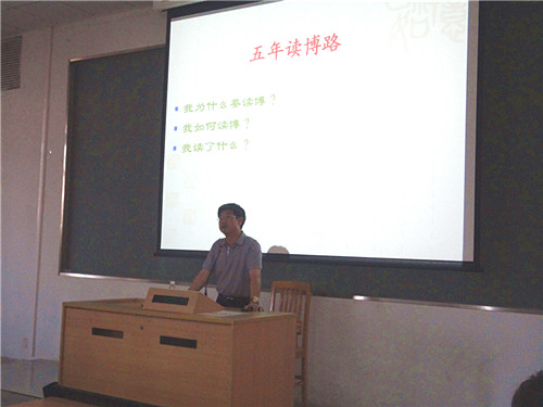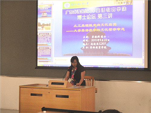 随后,霍院长登台主讲。他首先与大家分享了自己读博的5年心路历程,从毅然放弃领导职位到为写作博士论文而废寝忘食,更用“春夏秋冬”形象地比喻读博之路,展示了个中的艰辛与不易。除此之外,霍院长还就自身经历对即将读博或准备读博的人士给予真诚的建议,令在场听众受益匪浅。接下来,霍院长从大学英语教学文化的实然存在、大学英语教学的现状与困境、大学英语教学中的工具理性情结、大学英语教学发展的文化走向、大学英语教学的本体之问、大学英语教学的价值之辨、大学英语教学的方法之思、大学英语教学的文化自觉等多个方面为大家展示了自己的博士论文《从工具理性走向文化自觉——大学英语教学的文化哲学审思》,提出“当代大学英语教学应从工具理性走向文化自觉”的独到学术观点。