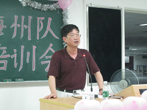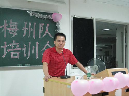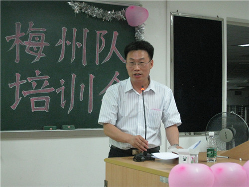 接下来进行了“为中华而教”梅州丰顺队培训。首先,霍院长对梅州三下乡工作进行了总指挥和总协调。他为大家介绍了梅州丰顺支教的项目背景和主要任务,指出本次三下乡活动不仅是一个服务社会的契机,也为老师和同学们提供了教学实习的好机会,更有利于提高当地的中小学英语教学水平。他动员大家响应“为中华而教”的号召,热情投身,快乐奉献。霍院长尤其强调了教学特色的问题,他鼓励老师和同学们在教学实践中贯彻“个性化”“校本化”和“快乐学习”的原则,合理运用“1+5”教学模式和诊断式的个别指导,根据实际情况灵活调整教学方法,寓学于乐。最后,霍院长为大家讲述了八条三下乡期间的注意事项,谆谆教导使在场师生获益匪浅。