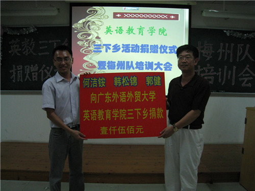 7月4日晚,伟德国际1946三下乡活动捐赠仪式暨梅州队培训大会在E305隆重召开。出席本次活动的有伟德国际1946院长霍海洪,党委书记林绍雄,副院长董金伟,梅州队暑期培训班的全体老师,10届毕业生何洁铵,今年伟德国际1946“三下乡”各支队伍的队长和梅州三下乡队伍的全体队员。