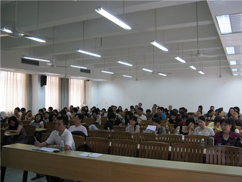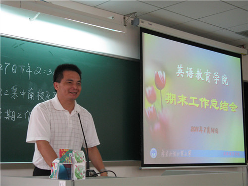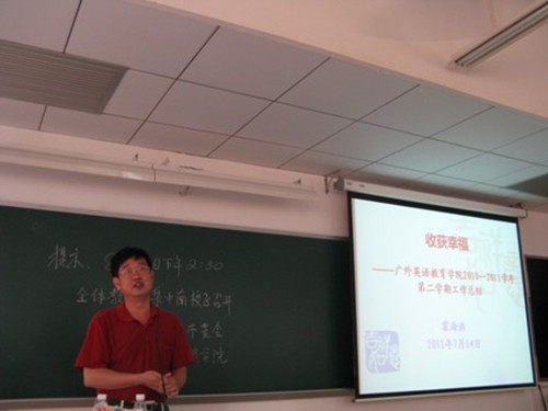 首先,由院长霍海洪代表学院做了题为“收获幸福”的总结报告。霍海洪在总结中指出,过去的一个学期是紧张忙碌、追求卓越、充实幸福的一个学期,在学校党政班子的领导下,学院上下齐心协力,共同奋斗,在教学、科研、党务、学工等方面取得了喜人的成绩,将一个又一个的幸福尽收囊中。接着,霍海洪如数家珍地历数道,本学期,除了圆满完成学校布置的各项工作外,围绕着教育部大学英语教学改革示范点的建设,学院承办了广东省大学英语教学比赛、曾丹和朱苑苑两位教师分别荣获广东省大学英语教学比赛的一等奖和二等奖、召开学校第一届专业英语教学研讨会、召开了两次网络教学平台论证会并对教师进行了多次网络平台操作培训、举行了大学英语文化月系列活动、启动了研究生英语教学改革、启动实施了梅州丰顺县支教项目、举办了系列教学工作坊、教师公开课和教学反思等教研活动常态化、举办了博士论坛和著名教授论坛等学术活动、获得了省市校级研究课题4项、选派了20余人次参加国内国际学术会议、选派了8名教师暑期赴英国参加与西敏斯特大学联合举办的教师培训班、学生合唱队荣获学校“唱支山歌给党听”合唱比赛一等奖、隧道宣传栏荣获学校宣传栏评比三等奖,等等。同时,霍海洪还对学院目前存在的宣传工作不力、科研工作乏力、少数教师单位归属感缺力、学生爱国荣校教育欠力等问题进行了剖析,要求针对这些问题,采取得力措施,加强工作力度。最后,霍海洪对下学期的工作重点进行了布置,他说,下学期,学院将承办全国外语院校大学外语教学研讨会、广东省大学英语网络教学现场会、全面推展基于计算机网络的大学英语自主学习系统、推进校本教材的编写等。霍海洪用富于诗意的“我耕耘,我收获,我幸福。幸福隐帅于付出奉献中,熔铸于锐意改革间。追求卓越,幸福蕴藏其中!”作为结束语。霍海洪的总结报告使与会者产生了强烈的共鸣,赢得了一阵又一阵的掌声。