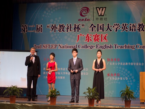 此次比赛的评委之一刘建达代表我校对各位嘉宾评委的到来表示热烈欢迎,同时对广东省教育厅、广东省高等学校大学英语教学指导委员会、上海外语教育出版社的精心指导和各兄弟院校的配合表示衷心的感谢。此外,他还介绍了我校鲜明的办学特色、实行国际化的战略目标、着力推进外语与专业融合的教学理念以及在大学英语教学模式创新方面的“五化”与“五大特色”。并表示,大学英语教学大赛为优秀的老师提供了一个施展才华和展现综合素质的舞台,提供了交流学习的平台。黄卫则表示,作为主办方,希望通过教学大赛与实际行动贯彻落实国家中长期教育改革发展纲要精神,为我国高教事业发展贡献力量。