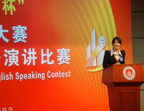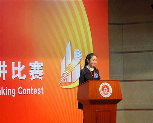 在上午的半决赛中,选手们临时抽取题目在15分钟的准备时间后进行为时3分钟的即兴演讲。我校高翻学院选手吕峪晶同学凭借其非常娴熟的英语口语、严密的逻辑思维、宽广的知识面和从容而又风趣的演讲风格征服了现场所有评委和观众,赢得了上午比赛中的最高分88分,并获得半决赛第一名,为我校赢取了首战的胜利。而经贸学院大二学生郑芳同学年龄小却志气高,虽身患感冒,仍然顽强拼搏,稳定发挥,最终以并列第九名的成绩与吕峪晶同学携手杀进下午的决赛。
