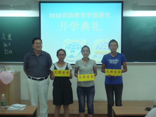 9月28日晚7点,2010年伟德国际1946新生开学典礼在教学楼F栋507拉开了帷幕。此次典礼由党委副书记易宗勇主持,出席的嘉宾有院长周富强,党委书记袁长青,副院长董金伟、杨满珍,学院英语教育系主任张效珍博士、学院办公室主任曾国华、学院辅导员迟殿凤老师和学院教务秘书沈献芹老师等。