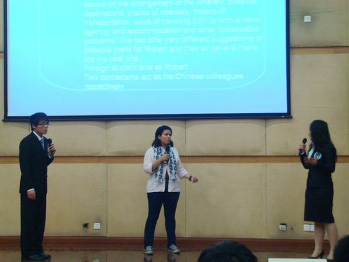 介绍完自己的队伍就进入了情景对话,这一部分吸引人的恐怕是外籍嘉宾Daniel和Sarah的搞怪客串了。不只是太“入戏”,还是他们俩故意“刁难”,对话中不时发生让选手“无言以对”的情况,小插曲不断。Sarah扮演的外国留学生遭遇感情危机,两名中国学生前去劝导,Sarah不断用手挠脸颊,表现出愁苦的样子,把我们带到一个近乎真实的情景中。Daniel扮演各种角色时走“耍宝”、“装糊涂”的路线,这也为难了许多选手。在即兴对话环节中,我们分别抽到了“H1N1预防”和“五一旅游策划”两个预设话题。在陈文辉师兄讲到H1N1的症状与普通流感不同时,不料Sarah突然反问一句“How do I know?”,这时桂卿师姐接上了Sarah的问题,绕过了险些出现的尴尬局面。这段有惊无险的小插曲体现了队员的默契配合和高超的随机应变能力,令人佩服。