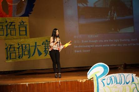 此次比赛分为两个环节。第一环节为选手的三分钟自我展示,第二环节为电影配音。在第一轮的自我展示中,来自经济统计学1301班的一号选手王翠以流利动听的英文,在舞台上自信而又富有激情地向观众们展示了过去的她和现在的她,表达出“ I have a dream to speak fluent English”,令人回味。来自英教1304的选手肖倩在自我展示中则同时扮演两个角色,模仿两种不同的口音向观众生动地展示了culturaldifferences,极具创意,吸引观众眼球,同时也获得了评委老师们的好评。自我展示中较为出色的还有来自播主1401班的七号选手陈榛榛的展示,她以一种幽默的方式讲述个人经历,同时还不忘与台下观众互动,她的流利而动听的英文给台下观众留下深刻印象,最后她以28.6的高分在第一轮的自我展示中领先(第一轮展示满分为30分)。第二轮的电影配音中,选手们竭尽全力模仿电影原音。配音材料涉及动画、经典片等多个方面,比赛精彩纷呈。经过两轮的激烈角逐,产生一等奖一名,二等奖两名,三等奖三名,优秀奖四名。(名单附后)