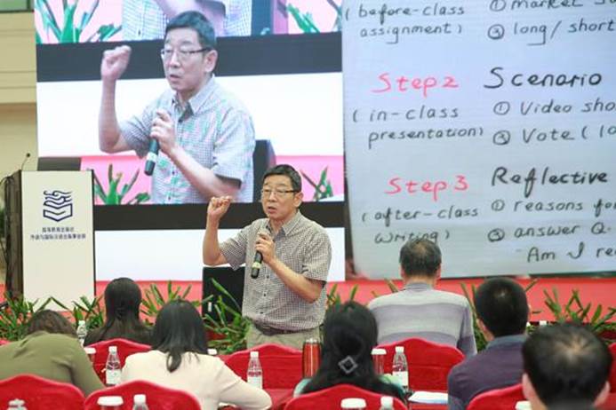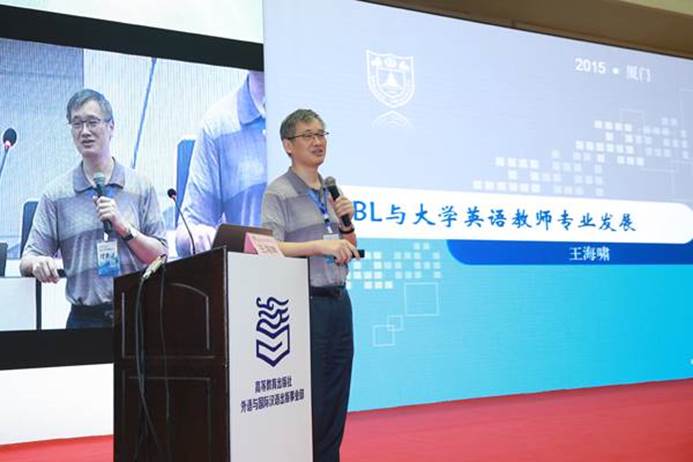 最后,教育部高等学校大外教指委秘书长王海啸作题为“PBL与教师专业发展”的报告,从大学英语教师们的自身职业和专业发展需求出发,启发、鼓励老师们尝试PBL教学法。