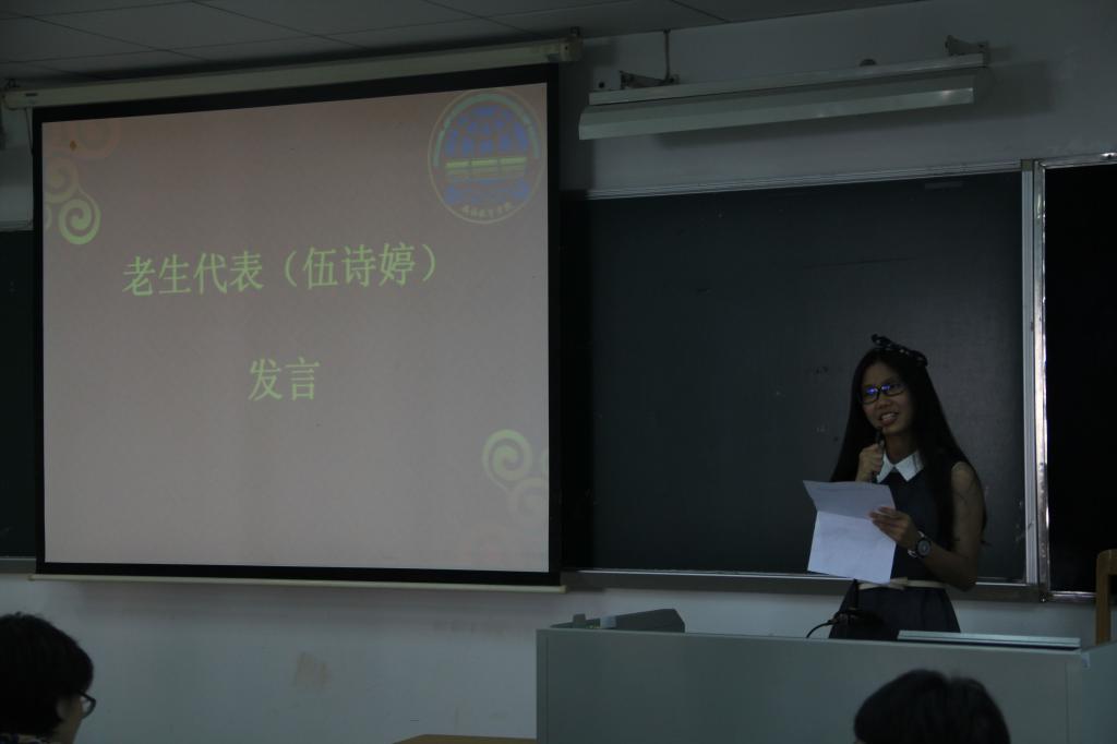 紧接着,13级老生代表伍诗婷上台发言。伍诗婷以自身经历,给师弟师妹们的大学生活指点迷津。她十分鼓励新生们多些参加社团活动,努力平衡好学习与工作之间的关系。发言期间,伍诗婷更是赠予新生们“勿忘初心,方位本心”、“不要泄气,忙不是理由,而是态度”等金玉良言。师姐对大学幽默风趣的诠释,让新生们听得津津有味,同时获得了全新的启发。