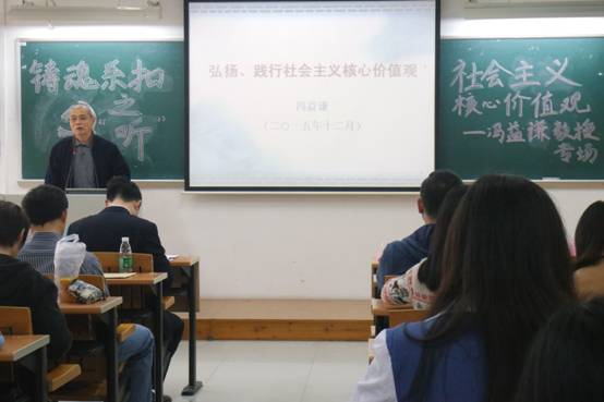 冯益谦融合了自己的学术研究和时事热点,从价值观入手,分别讲述社会主义核心价值观的内容、社会背景、弘扬的必要性,指导在场师生如何科学认识非核心价值观中的各种社会思潮,并希望大家能够将社会主义核心价值观内化为信仰、外化为行动。