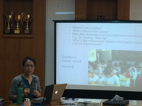 郑老师从21世纪语言学习面临的机遇和挑战入手,以生动的例子对比了几种不同的语言学习模式:school-based learning、project-based learning、mobile-based learning、value-based learning和place-based learning。她主要围绕如下几个方面分析了各自的利弊:教师和学生的角色分别是什么,该学习环境能给学生提供哪些互动机会。基于移动的学习(mobile-based learning)的最大特点是能利用碎片化时间学习,是随处学习(ubiquitous learning),而基于项目的学习是learning by doing,同时也是价值实现(values-realizing)的过程,师生和生生关系是expert-novice的关系,教师和课本的权威性被打破。在基于地方的学习中,学习者与环境(包括移动设备)始终有互动,而且人人都可能是care taker。任务型教学拘泥于课堂linguistic interaction,但基于项目和地方的学习则超越了这一局限,属于EDD。