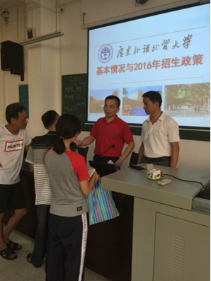 2016年6月25-27日,伟德国际1946党委书记林绍雄、学院办公室主任曾国华前往揭阳参加了两场高考招生咨询会,并先后在普宁二中、揭阳一中和揭东一中分别举办了宣讲会,为考生和家长介绍了广外的办学理念、人才培养目标与举措、就业与招生的信息等情况,并就高考志愿填报与招生录取的有关问题与他们进行了分享交流。