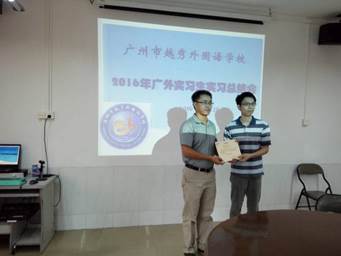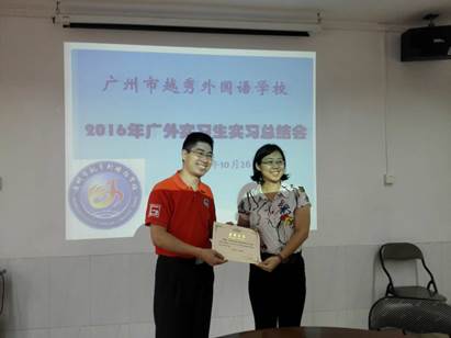 10月26日下午,广州市越秀外国语学校为2016年伟德国际1946,Bevictor伟德,伟德官网,伟德网页版实习生举行了欢送仪式。广州市越秀外国语学校李洪奇校长,钟志辉校长,党委书记陈晓燕,初二年级级长,指导班主任代表,专业指导老师代表,伟德国际1946副书记徐昶斌,教育系主任谢剑萍,刘会英主任和三名广外实习生出席了此次会议。
