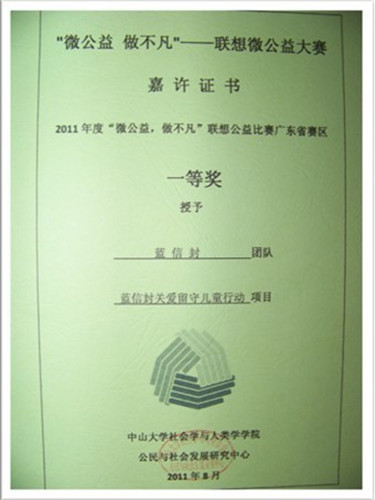 2011年,广外蓝信封组队参加“微公益,做不凡”联想微公益大赛,获得广东赛区一等奖,同年作为唯一一个大学生公益团体,入围中华儿慈会“童缘”资助项目。
