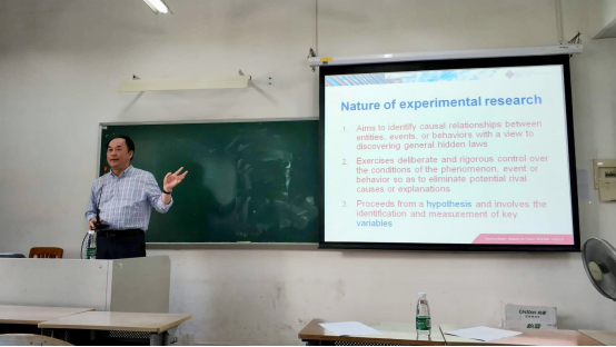 胡教授首先解释了实验性研究的性质,指出实验性研究实质是在一定控制条件之下的经验性测验,是用于检验由一个理论或其他信息来源推导出的因果关系的假设的有效性的研究方法。研究开始于由理论演绎或观察归纳而得出的一个假设,研究者在预想假设成立的基础上,用演绎法推进以确定预期的结果,然后收集、分析所得出的数据,最终证明假设成立或不成立,或需为进一步研究继续修改。