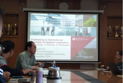 2018年11月22日下午,来自香港理工大学的广外云山讲座教授胡光伟为伟德国际1946师生作了题为“Publishing in International Journals of Applied Linguistics: Processes, Practices, & Strategies(如何在应用语言学类国际期刊上发表文章:过程,实践与策略)”的讲座。本次活动由熊涛副院长主持,出席本次讲座的还有陈金诗副院长,以及院内外感兴趣的老师和同学。