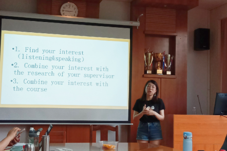2017级研究生吕晓佳做了题为《跌跌撞撞奔向你——我的学术探索之路》的报告,从“如何定义自己的研究领域”、“如何发现学术会议信息”、“如何筛选及参加学术会议”、“如何有效管理时间”几个方面分享了满满的学术探索干货,研究生们纷纷表示获益匪浅。