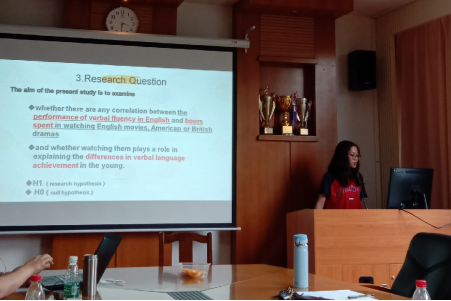 2018级研究生关欣怡分享了自己的研究成果《观看英美剧电影时长和英语口语流利度的相关性研究》,分别从研究意义、研究设计、研究结果等方面进行了详细汇报。随后,几位硕士研究生导师对她的研究予以了一定的肯定,同时也提出了很多宝贵意见和改进建议,并对此类学术交流会议的开展提出了建议和展望。最后,持续两个半小时的研讨在师生热烈的思想交流中落下帷幕。