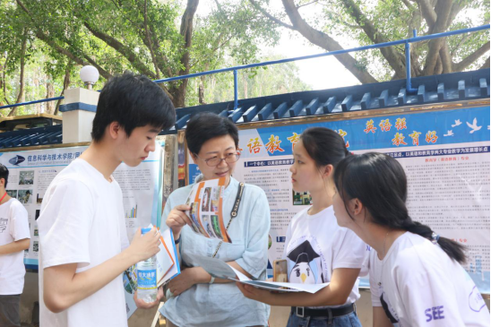 团学的志愿者们也积极参与开放日活动。他们不仅主动地向考生及家长分发学院宣传手册,积极宣传学院“英语强,教育好”特色,还向考生和家长们介绍了本学院丰富多彩的第二课堂活动等内容,让考生及家长们对教育学院留下了良好的印象。