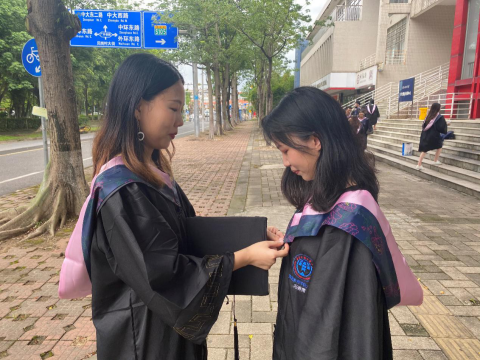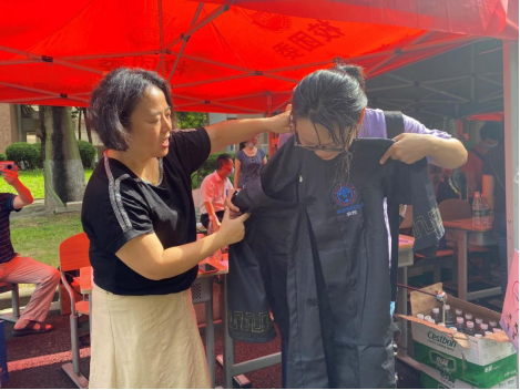 (学生拿到专属的学士服)