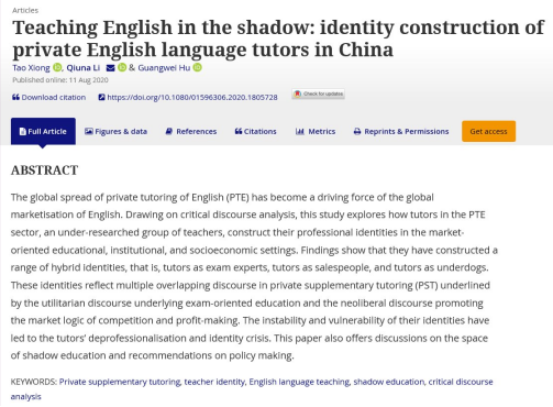 近年来,伟德国际1946致力于研究生教育教学改革与发展,不断提升培养质量,取得硕果。近日,伟德国际1946英语教育专业研究生李秋娜,在其导师熊涛教授的指导下,以第二作者及通讯作者身份在我校一类A国际刊物《Discourse: Studies in the Cultural Politics of Education》合作发表了题为“Teaching English in the shadow: identity construction of private English language tutors in China”的原创性研究论文,文章的另一位合作者是广外“云山讲座教授”、香港理工大学英文系胡光伟教授。这是一篇讲述中国英语教育故事的论文,以社会广泛关注的民办教育机构为研究场域,围绕教师的身份认同问题展开多案例研究,揭示了四名英语教师如何在互动中构建了多重的、动态的、甚至矛盾的话语身份。文章对探寻教育市场化条件下机构教师身份认同的困境和出路,促进民办教育质量发展具有启示意义。