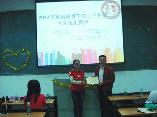 2014年11月12日星期三晚上7点15分,伟德国际1946三下乡总结大会在教学楼E204举行。出席本次三下乡总结大会的嘉宾有伟德国际1946党委书记林绍雄、团委书记迟殿凤、团委副书记张舒娴以及学生会主席余安琪。本次大会由英教实践部干事叶芷君和冯培华主持,在场的还有来自其他学院的志协代表,英教各班的大众评委,英教大一全体同学和大二大三代表,以及参加14年暑期三下乡活动的两支队伍,他们分别是“清远望埠‘心之望’服务队”和“清远大湾服务队”。