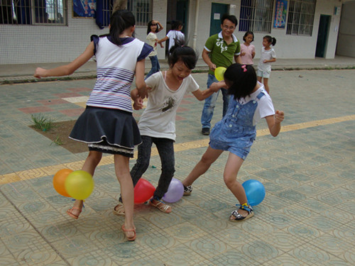 气球爆裂的“啪”、“啪”的声音和孩子们的激动地尖叫声回荡在中庭空地,这就是最吸引人眼球的就是踩气球游戏。男生和女生、小学生和初中生,都被这个游戏迷住了。孩子们尖叫着跑啊跳啊,既不愿意自己的气球被踩到,也要尽可能地去踩别人的气球。他们像斗鸡一样在空地里相互接近又飞快地跳开、伺机进攻又小心防守。场边观看的孩子们也乐得直拍手叫好,加上气球爆裂的声音和孩子们的尖叫声,这就是最好的“广告”,排队的孩子们越来越多。这可忙坏了场外的老师们。吹气球、绑气球、剪绳子,老师们简直一刻也停不下来。欢乐的漩涡持续了一整个上午。