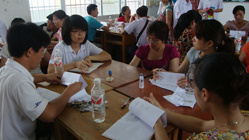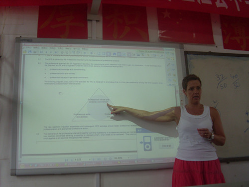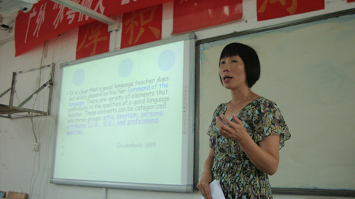 24日下午,来自英国的邓迪校长在经过了漫长的旅途之后终于到达了三江中学。她也给参加培训的学员们上了别开生面的一节课。她主要介绍老师如何评估学生以及学生如何评估老师的方法技巧。其中,邓迪校长特别介绍了K M L教学法。在对待学生的教学方法上,她特别提到了因材施教的问题。在课堂的后半段是互动环节,参加此次培训的学员们也根据自己在教学中遇到的问题对邓迪校长进行了一些提问。邓迪校长耐心地一一作出了解答。