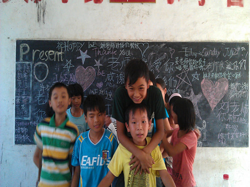 下午放学后,许多学生都留在课室里围在老师们的身旁,与他们谈心、合影,并叫老师们留下联系方式。有些学生把自己亲手做的手链,亲手折的纸花送给了老师们。然后,很多学生在黑板上画画,还写下“Thank you”、“感谢老师教会我们这么多知识,我们爱你们”、“祝老师天天开心”等话语送给老师。没想到一向调皮捣蛋的学生,会在今天表现出对老师的如此爱戴和依恋,在场的老师们都非常感动。