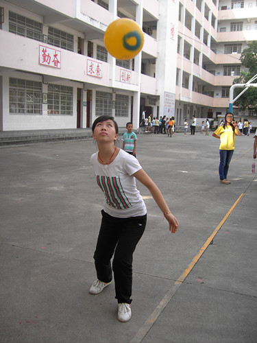 高二两个班的小组赛也进行得有声有色,当中也有不少气排球高手,他们有足够的跳跃性,有标准的发球动作,有漂亮的扣杀。在接球和反击飞过来的球过程中,她们充分利用周围的空间,跑、跳、接、击,往往是一气呵成,一点都不拖泥带水。
