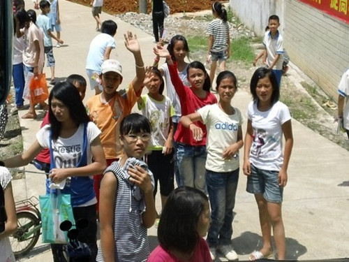 来接队员回程的汽车在下午一点准时到达,学生们拿起大包小包帮队员们放入车内,队员们握着学生们的手诉说着不舍的惋惜。学生们用真诚的目光看着队员,用恳求的语气问:“老师,你明年还来吗?明年还来看我们好不好?”正当大家都互诉离别之情时,有一位女生接近中暑而头发晕,我们的队员和一群学生扶她到树荫底下,一边帮她扇风一边帮她擦汗,尽到作为一名老师的最后的职责。