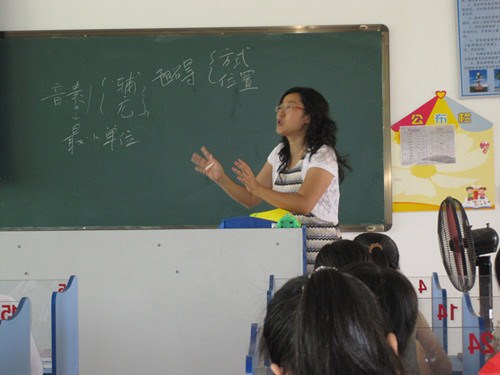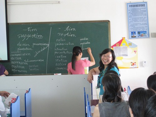 肖建芳老师的灿烂的笑容给她的课堂营造了轻松愉快的气氛。在课堂上,肖老师结合教学内容,跟学员们一起玩“词汇银行”的小游戏:两组的学员把“tion”结尾的单词写在黑板上,写得最多的那组便获胜。游戏开始后,学员们绞尽脑汁,然后飞快地跑上讲台,到黑板上写下单词,有时还跟我们这些助教共同商议。肖老师很注重学员们对课堂的期望,并布置了相关作业。课后,学员们纷纷向助教们表示尽管自己不能完全听懂肖老师的口语,但仍十分感谢肖老师带给他们的生动的课堂。