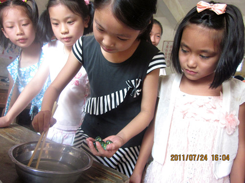 下午3:00,大湾中心小学的四个班级兴高采烈地从班主任手中领到游戏券后,2011年英教学院清远英德大湾队英语夏令营的游戏创意比赛便正式拉开了帷幕。无论是三年级的小朋友还是六年级的高个子都兴致勃勃地在各摊位门前排好队,既兴奋又紧张地期待自己闯关成功。本次游戏创意比赛的四个摊位由各班级师生共同设计、组织,分别是三年级Legend班的“超级无敌夹波珠”、四年级Outstanding班的“贴贴乐”、五年级Victory班的“夹一夹,更开心”以及六年级Excellent班的“吹吹乐”。各个游戏均与最近学生所学的英语知识挂钩,以便于在为学生们送去欢乐的同时也能够达到让他们学以致用的目的,一举两得。