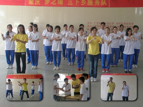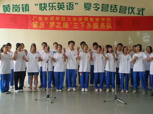 仪式开始,首先邀请了肇庆市第四中学副校长杜青霞女士讲话。她不仅谈到大学生在“三下乡”过程中获得了宝贵的实践经验,更说到黄岗区的中学生们结识了许多“亦师亦友”的大学生,培养了学习英语的兴趣,最重要的是在夏令营中收获了快乐。