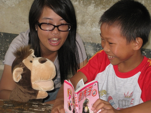 座位的编排对课堂气氛的影响是不容忽视的。清远队队员充分利用以前课堂上学过的教育学常识,根据上课的内容采用不同的座位编排方式来吸引学生的注意力,以使学生更好地融入课堂。左图中在快乐阅读课堂上,学生座位呈“o”形,把老师包围在其中,老师低头侧耳仔细聆听每个学生的发音,整个课堂笼罩在温馨和谐的氛围下;右图语音语调课堂中,老师运用分组、让学生进行组间竞赛的方式激发学生学习的积极性,课堂气氛非常活跃。